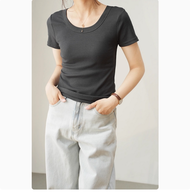 优可丝木纤维 薄款 女士螺纹修身T恤 大圆领短袖打底衫 山东网店